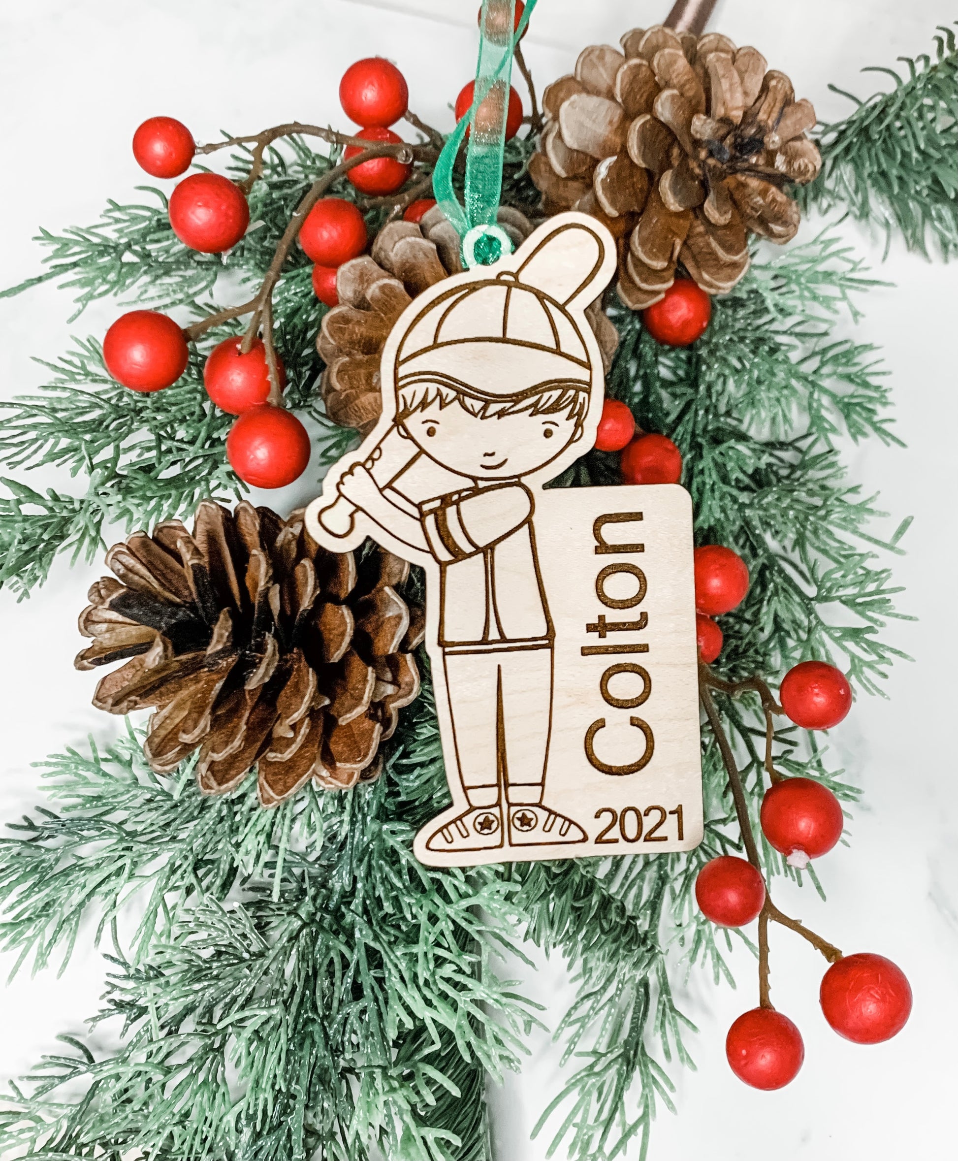 Baseball player personalized ornament. A wonderful addition to any tree and makes a great gift for Christmas for that special athlete in your life. Made out of Maple and laser engraved with your athlete's name and choice of year. Please enter your personalization and year in the box below. Comes with a hanging ribbon.