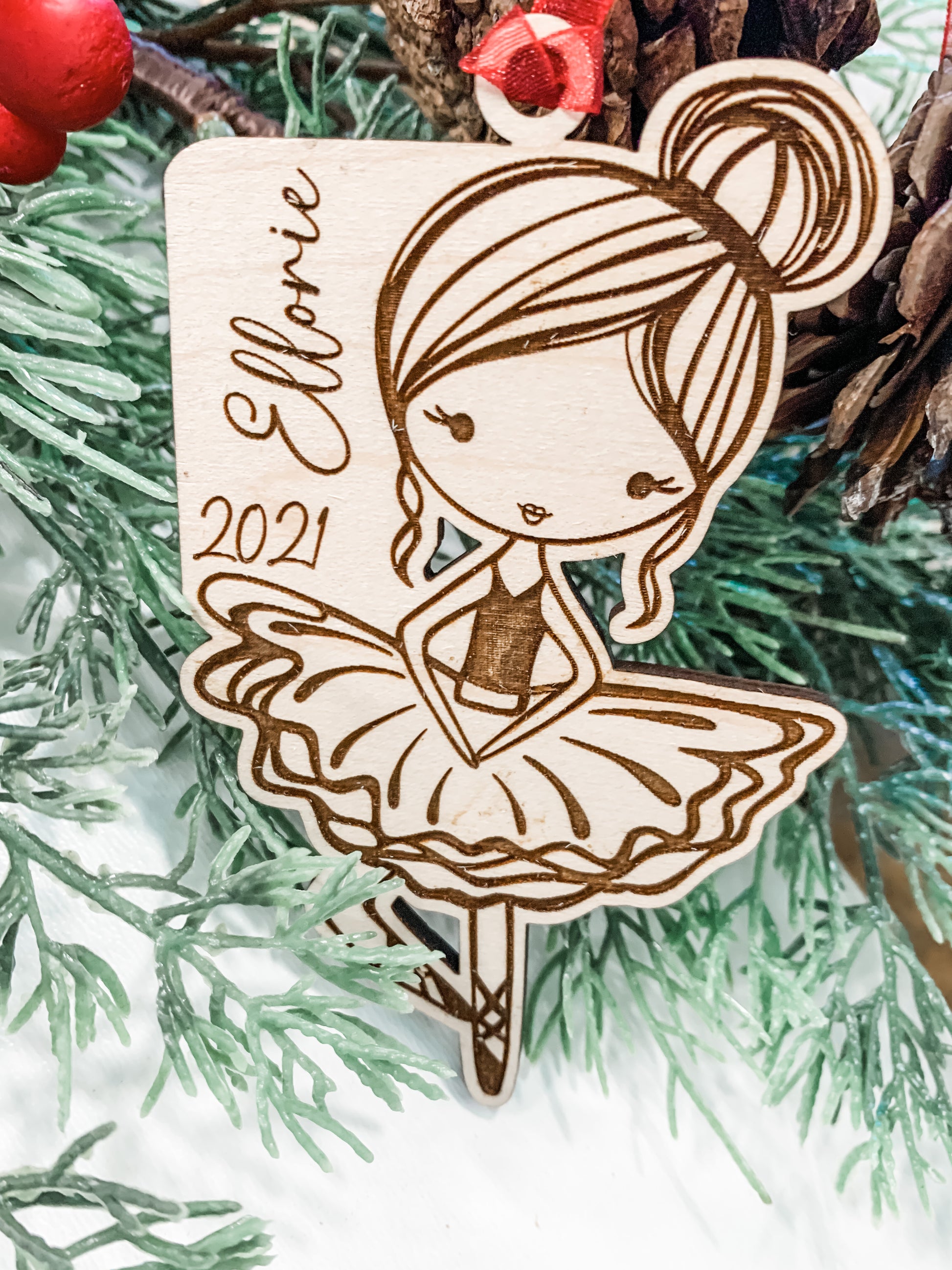 Celebrate the dancer in your life this Christmas with a beautiful personalized dancer/ballerina ornament. A wonderful addition to any tree and makes a great gift. Made out of Maple and laser engraved with your dancer's name and choice of year. Please enter your personalization and year in the box provided. Comes with a hanging ribbon.