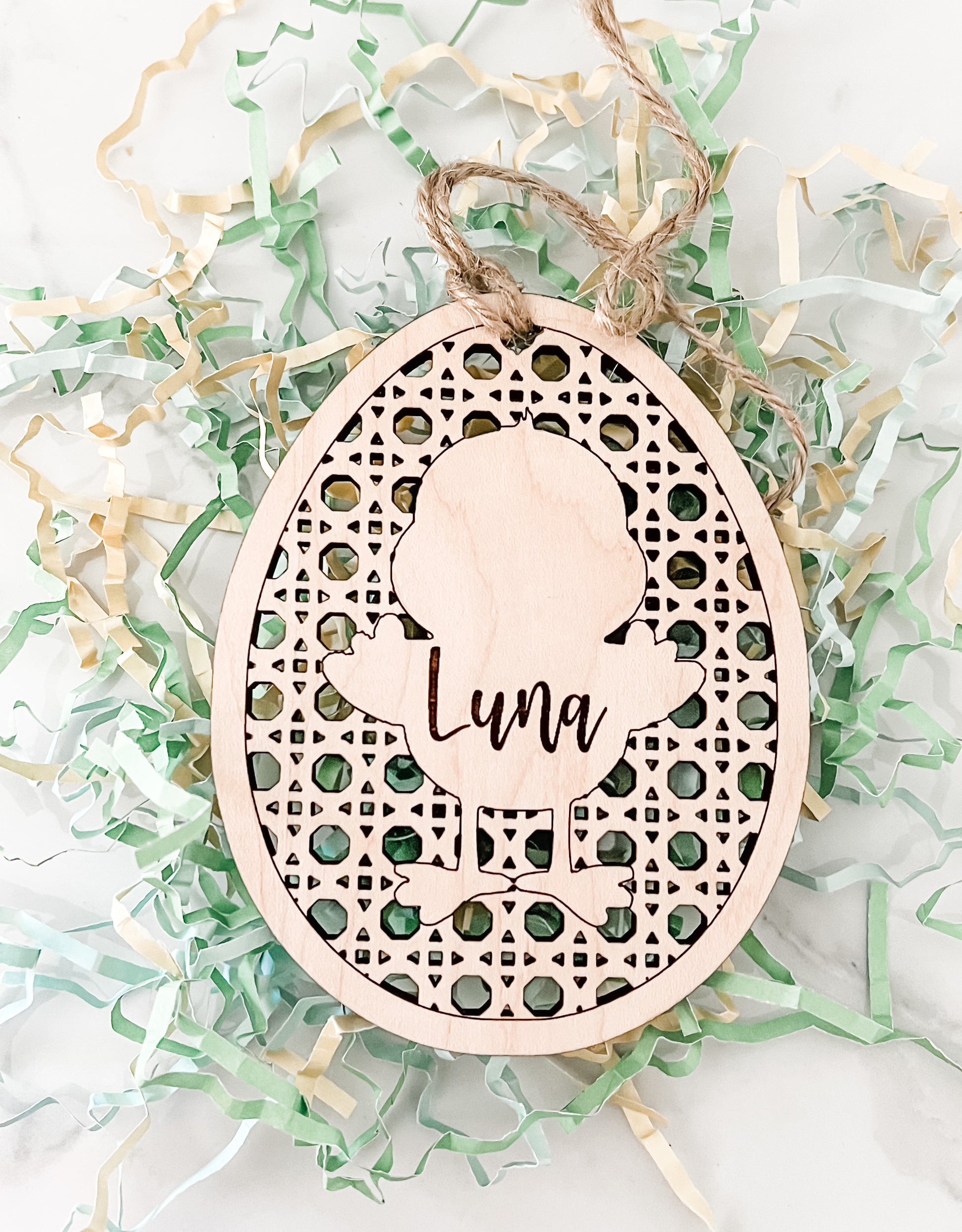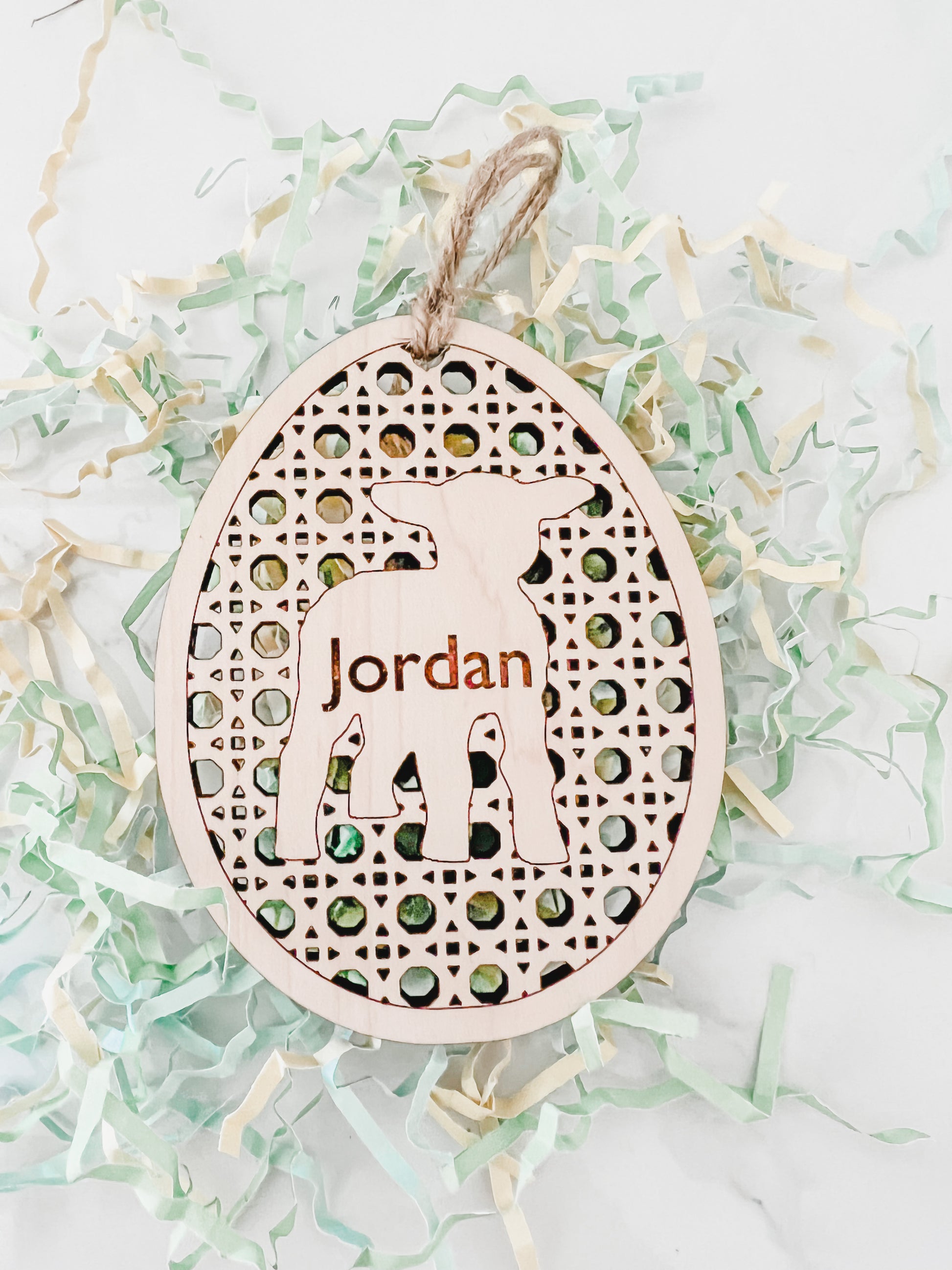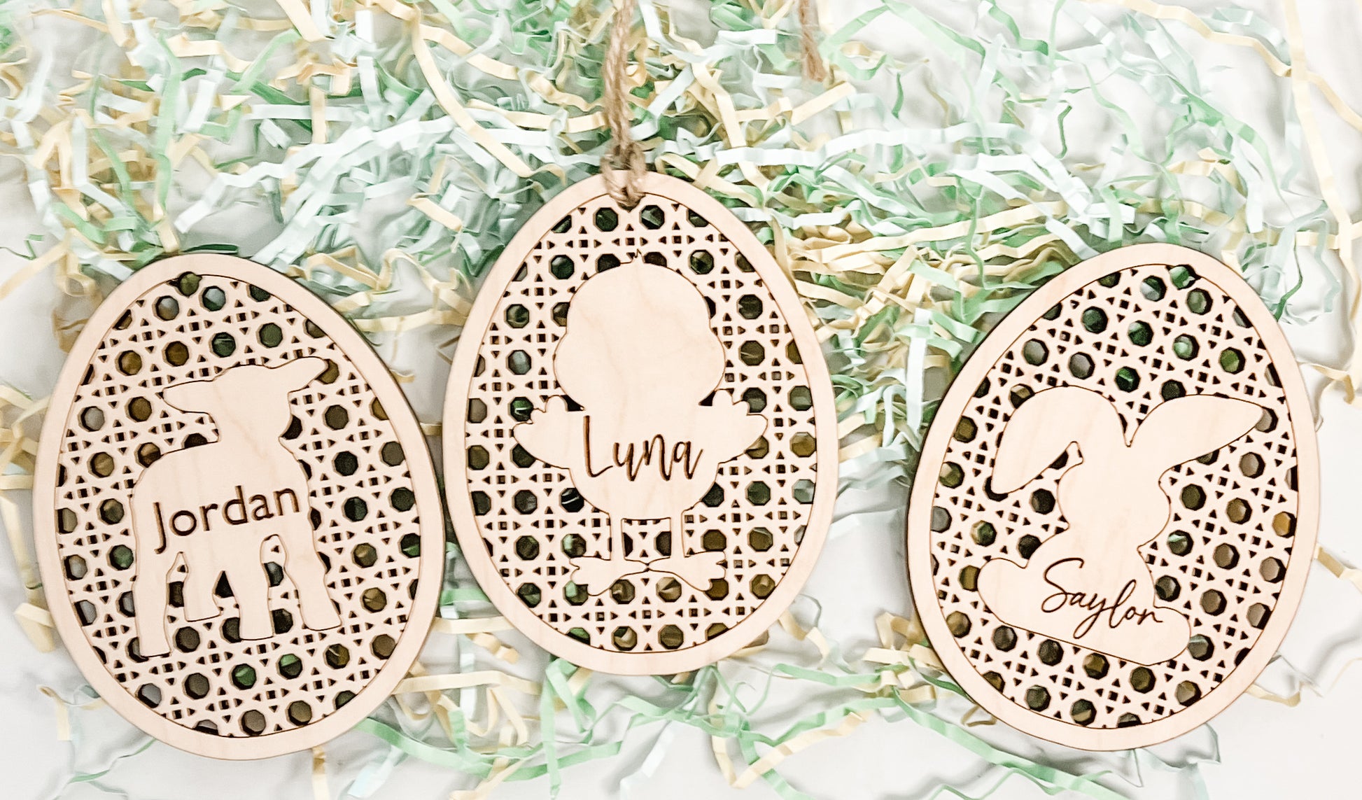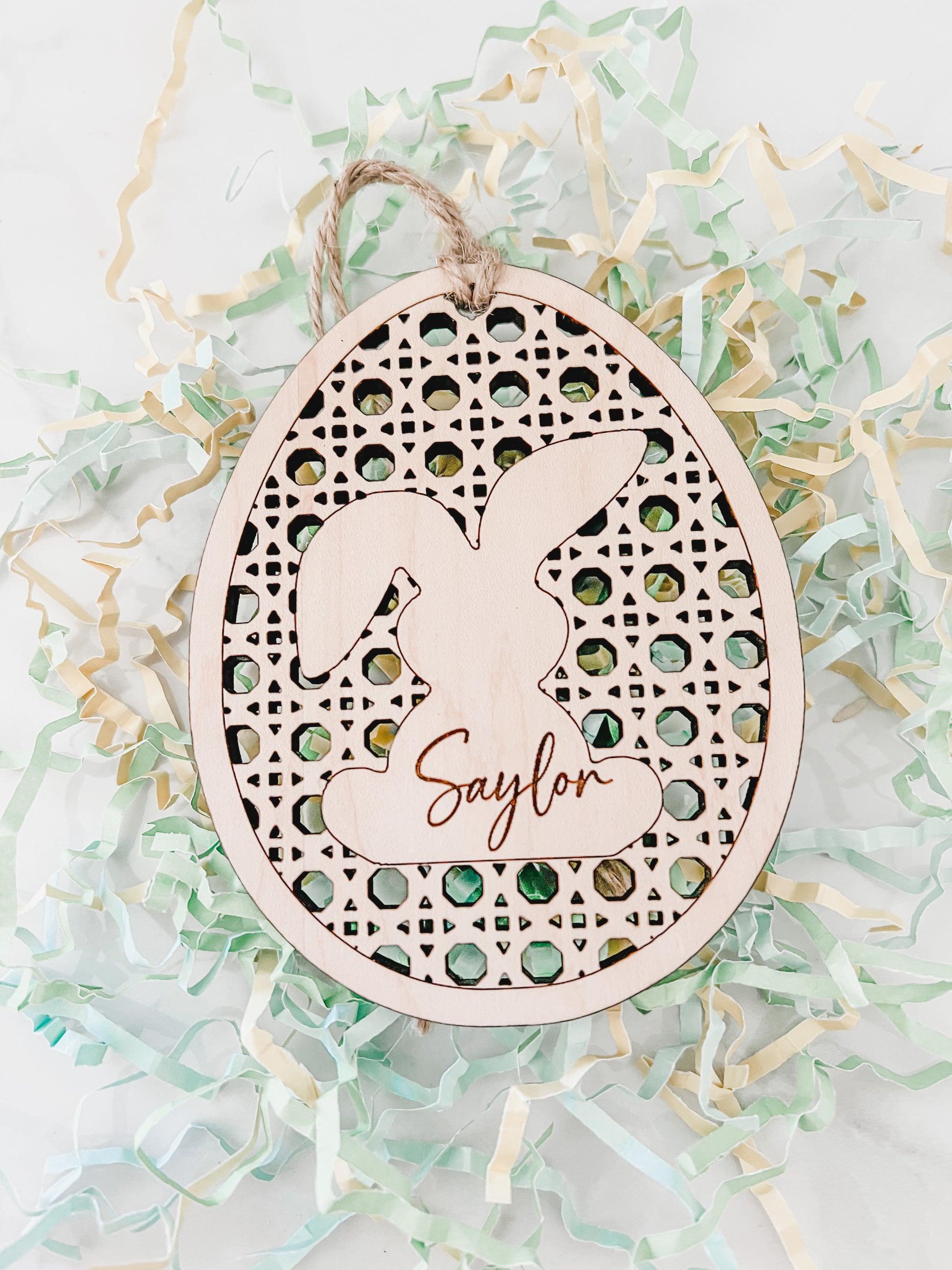 Add a personalized touch to any basket, bucket or bag with our cute bag tags. Featuring an egg shaped rattan pattern with your choice of a a bunny, chick or lamb customized with your name or saying. Please enter your personalization in the box. Made out of Maple. Hanging string included.