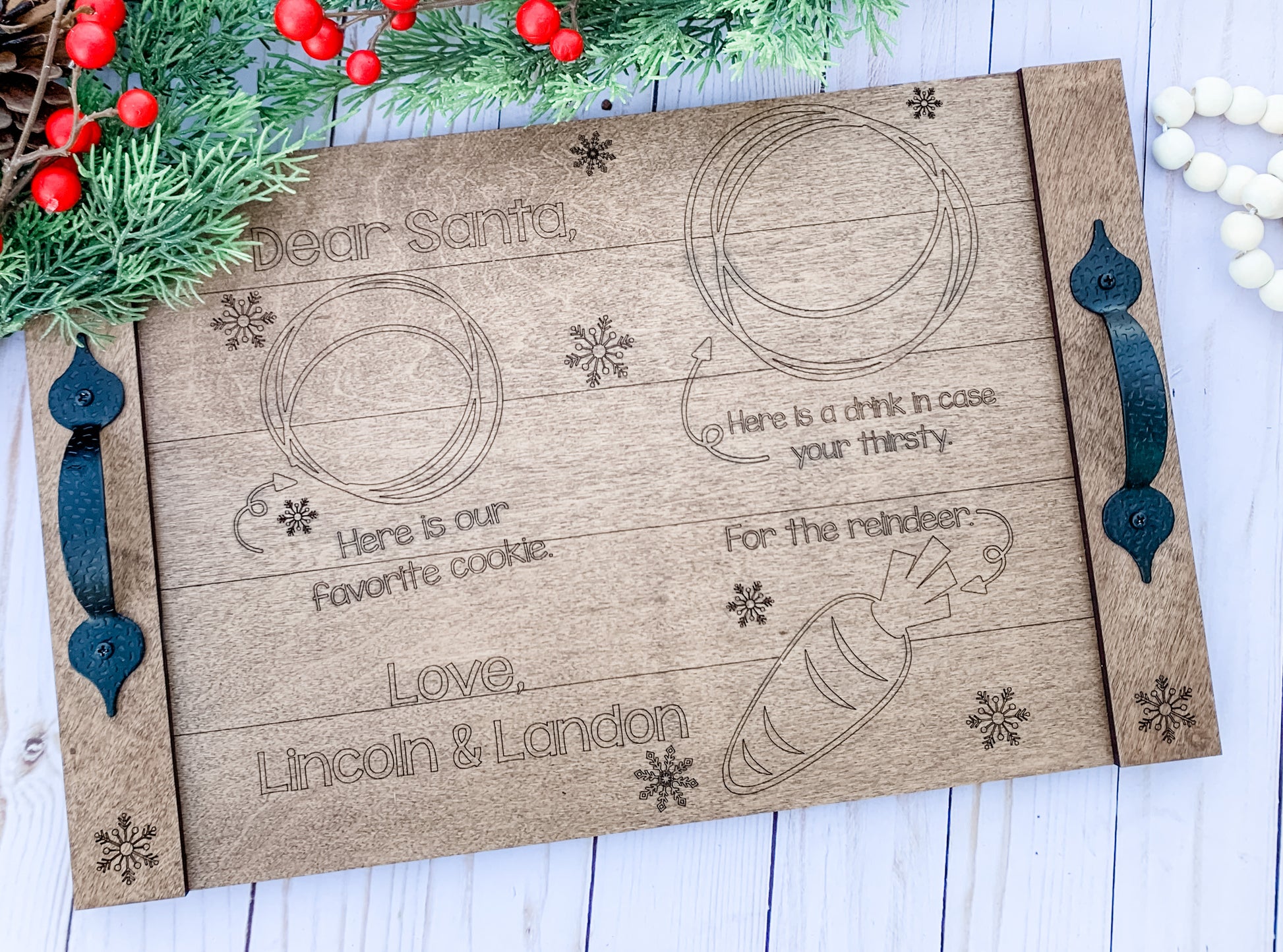 Handmade Santa treat trays customized with your child/children's names. Great as a decorative piece and fun for the kids to set out for Santa on Christmas Eve. Made out of maple and measures 16x10 inches. Choose natural or Walnut stained. Please enter your personalization in the box provided.